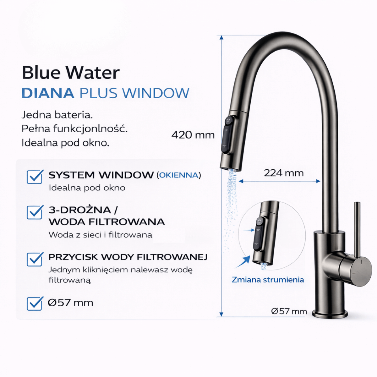 Bateria trójdrożna Blue Water Diana Plus (window) z wyciągana wylewką, bateria okienna, grafit (gun metal).
