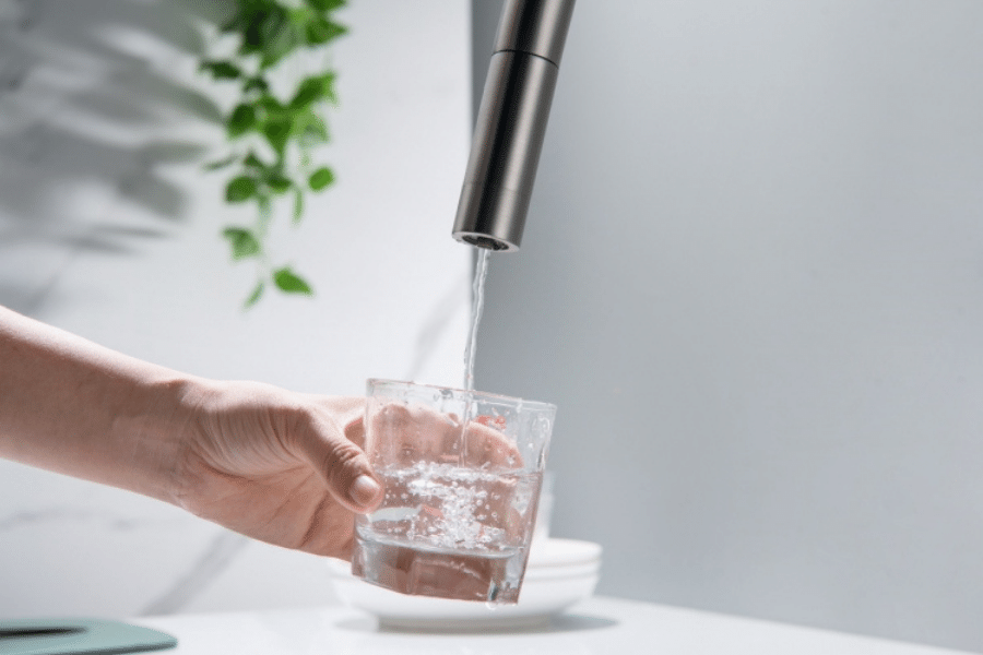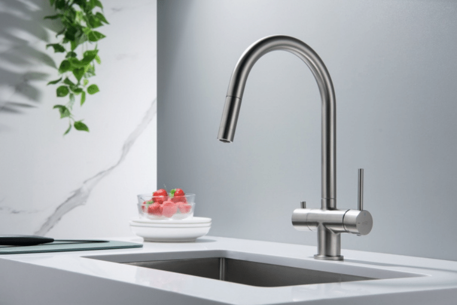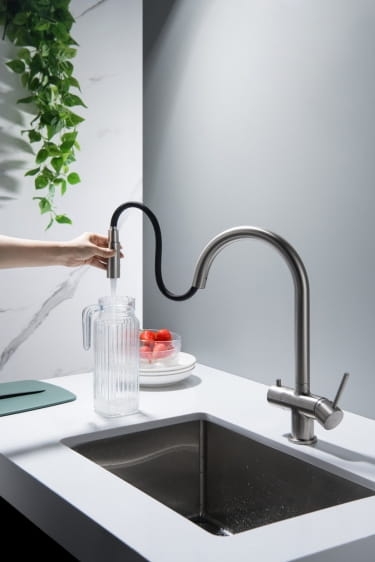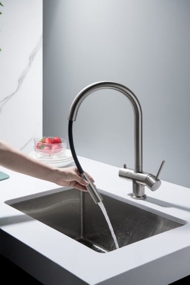 Zastosowanie tego rodzaju kranu umożliwia pobieranie wody filtrowanej oraz sieciowej (zimnej i gorącej) z jednego miejsca.