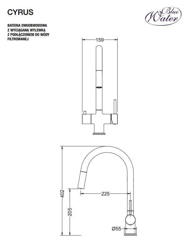 Cyrus kolor stali kran dwuobwodowy Blue Water z podłączeniem wody filtrowanej. Bateria trójdrożna z wyciąganym kranem.